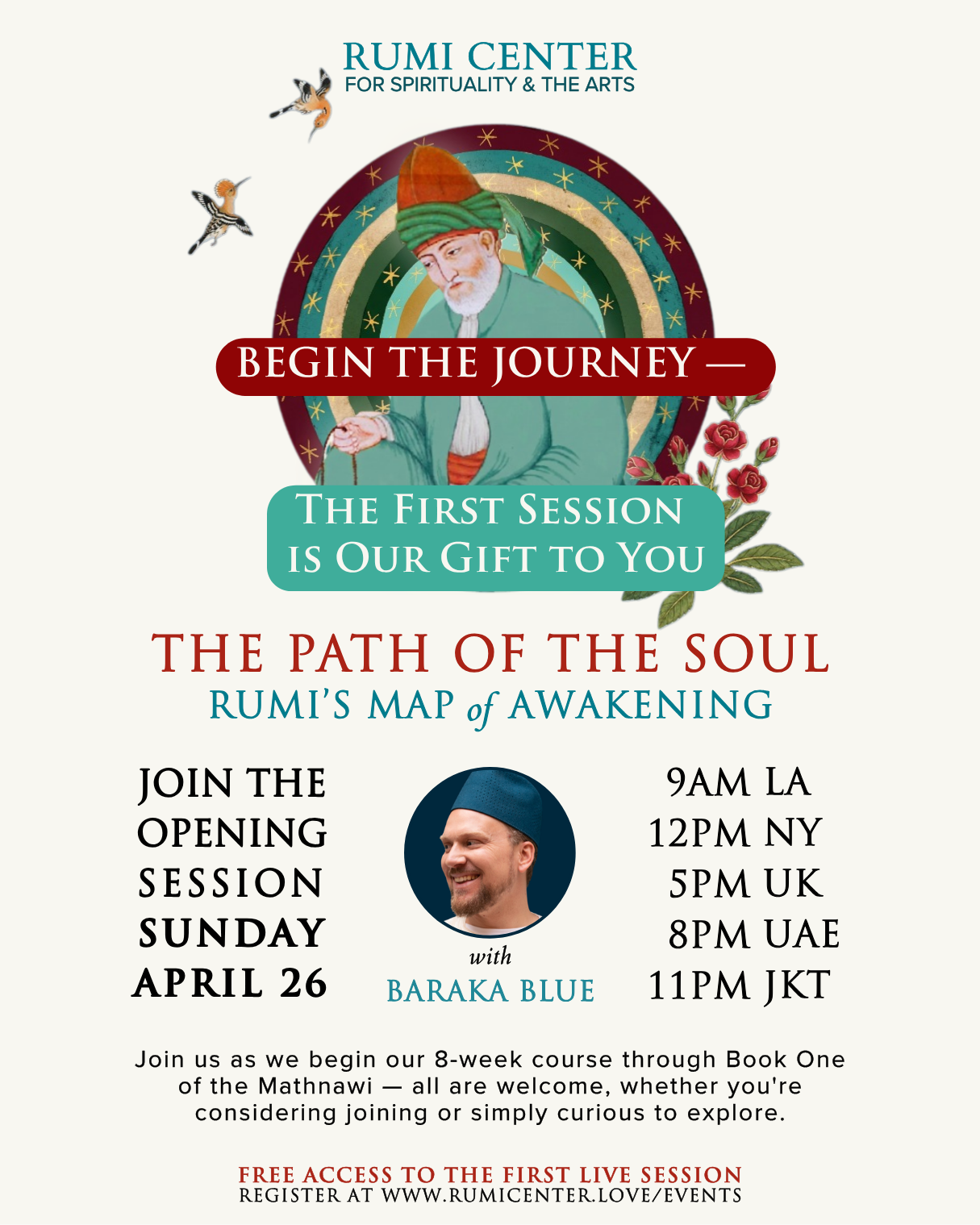 Join us as we begin our 8-week course through Book One of the Mathnawi — all are welcome!SUNDAY April 26, 2026at 9Am LA | 12Pm NY 5pm UK | 8pm uAE Register to get the link Register to get the link